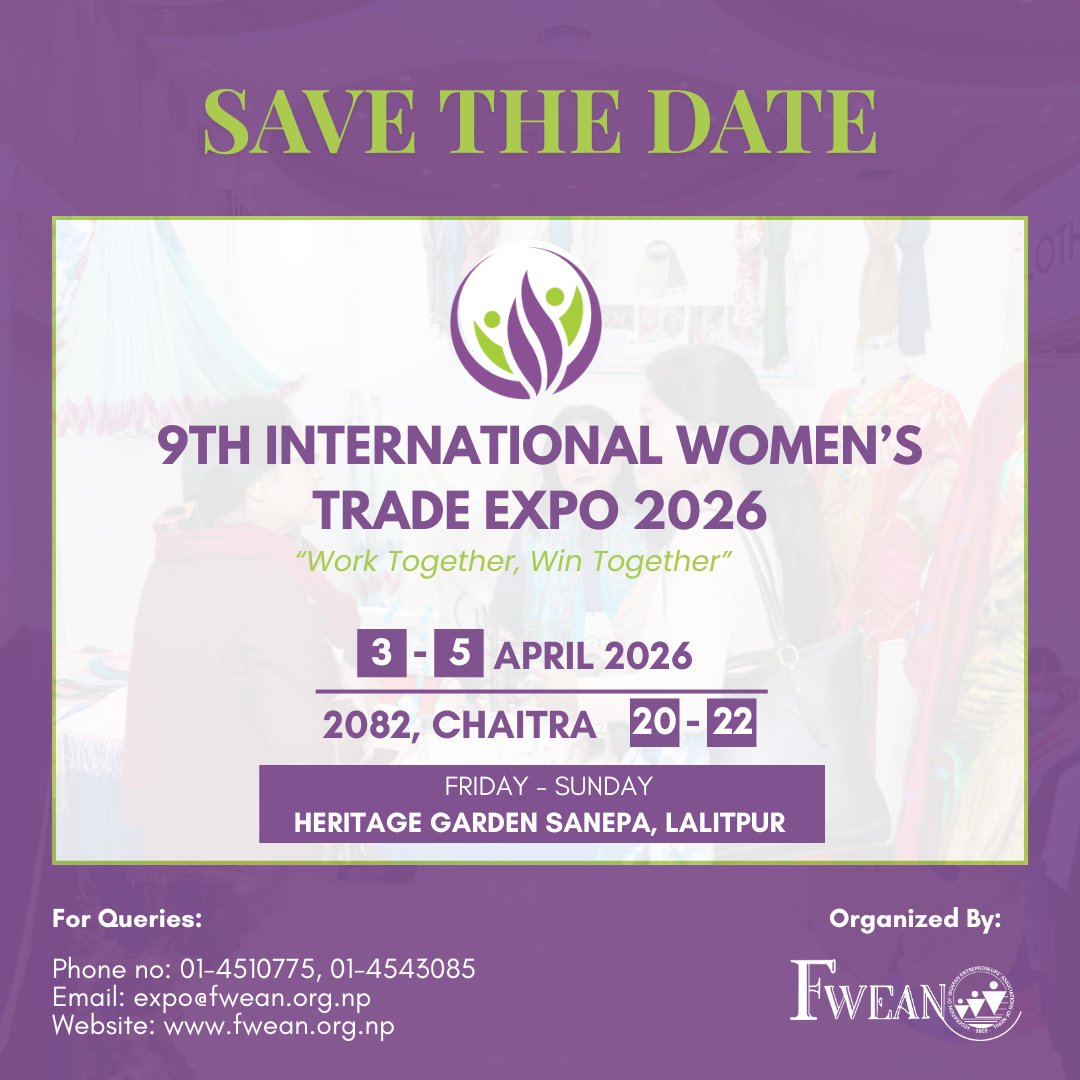 Over the past 10 years, FWEAN has been successfully organizing the International Women’s Trade Expo organized in Kathmandu. Giving continuity to this trend, FWEAN is organizing the 9th International Women’s Trade Expo this year from April 3rd to 5th 2026 (Chaitra 20th to 22nd 2082), Friday to Sunday at Heritage Garden, Sanepa, Lalitpur.